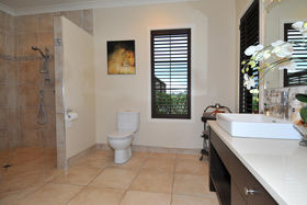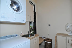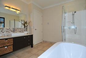 The large family living area faces north for all day sun and an entertainer's kitchen unfolds to your right, incorporating spacious composite bench-tops, two sinks, a built in coffee machine and bar fridge. Two sets of French doors open this area out to the garden and also to a covered outdoor room with gas fire and shutters which can be adjusted dependent on the weather.