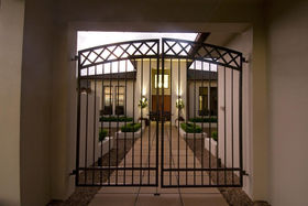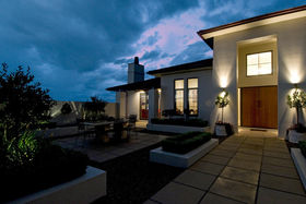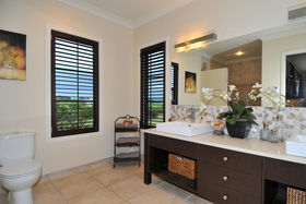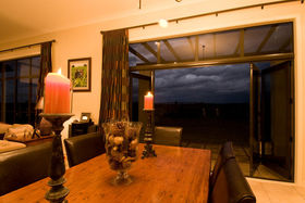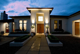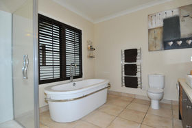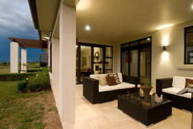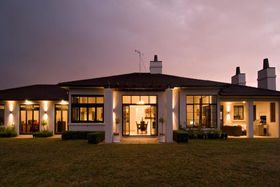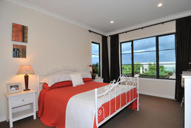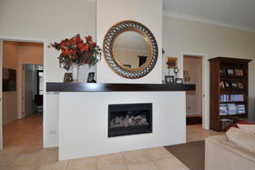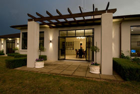 Approached through electronic gates the house is set on three acres of lawn and gardens. A triple garage protects the main house from prevailing winds and provides one side of an elegant internal courtyard, reached either through the garage or another set of gates. This restful space incorporates manicured gardens, a fountain and outdoor eating area just perfect for watching the sunsets. Across the courtyard, the main front door welcomes visitors into a four metre high atrium. In a nod to classical European farm houses, the home boasts wooden shutters, tiled floors, copper spouting plus high studs.