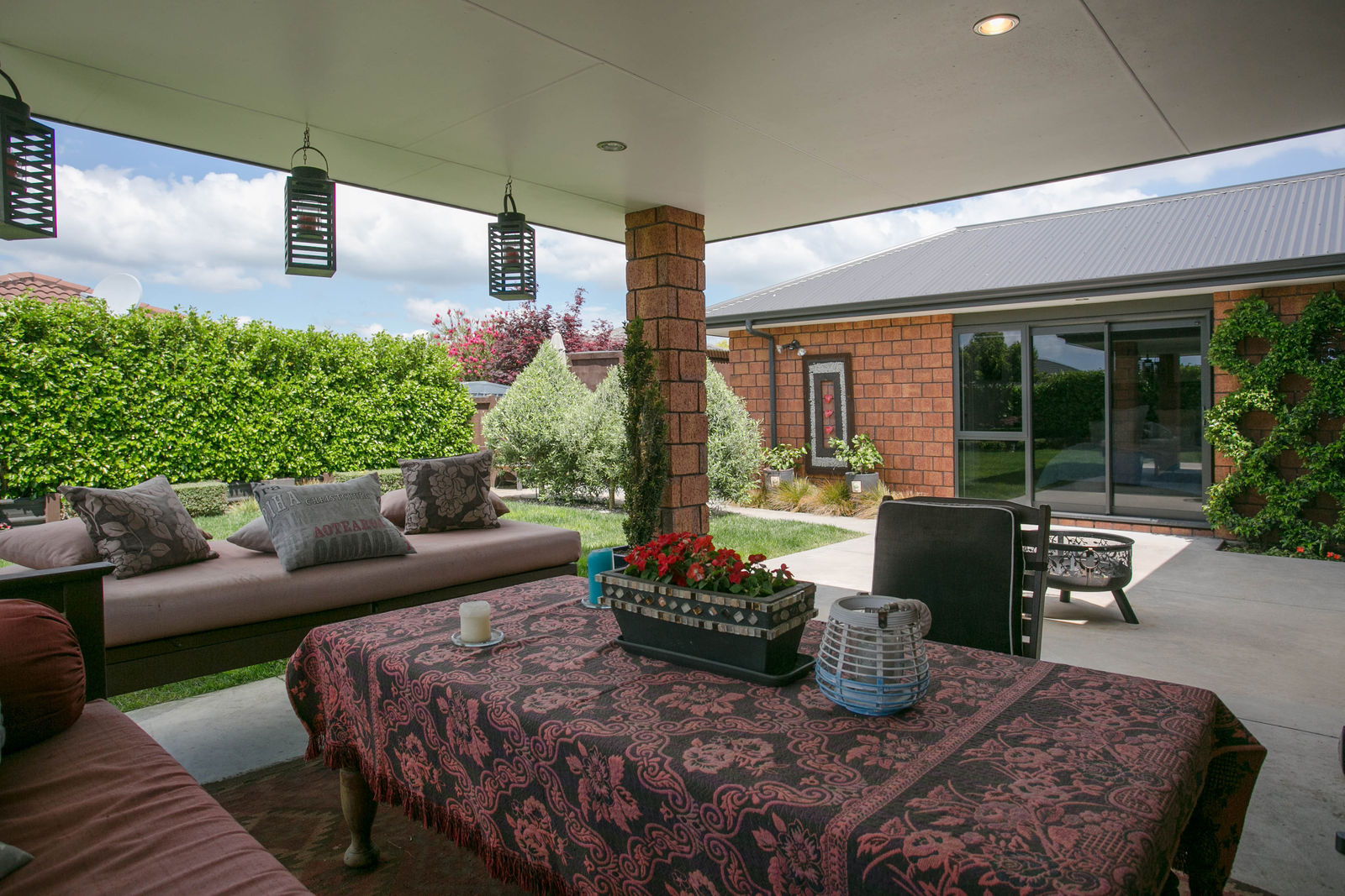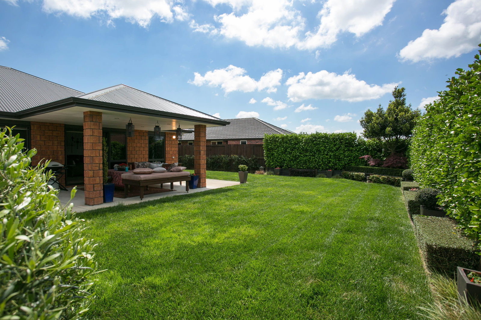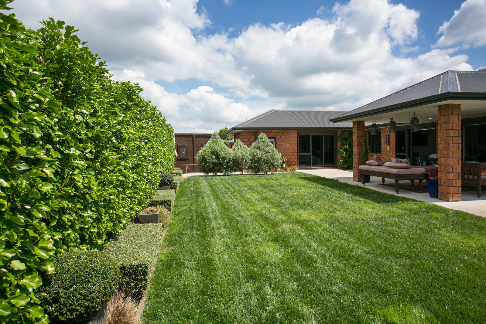 The kitchen, dining and main living room are all open and you can access the funky portico outdoor living space from this area. There is topiary in the garden that gives great structure and at the same time creates a relaxed backyard.