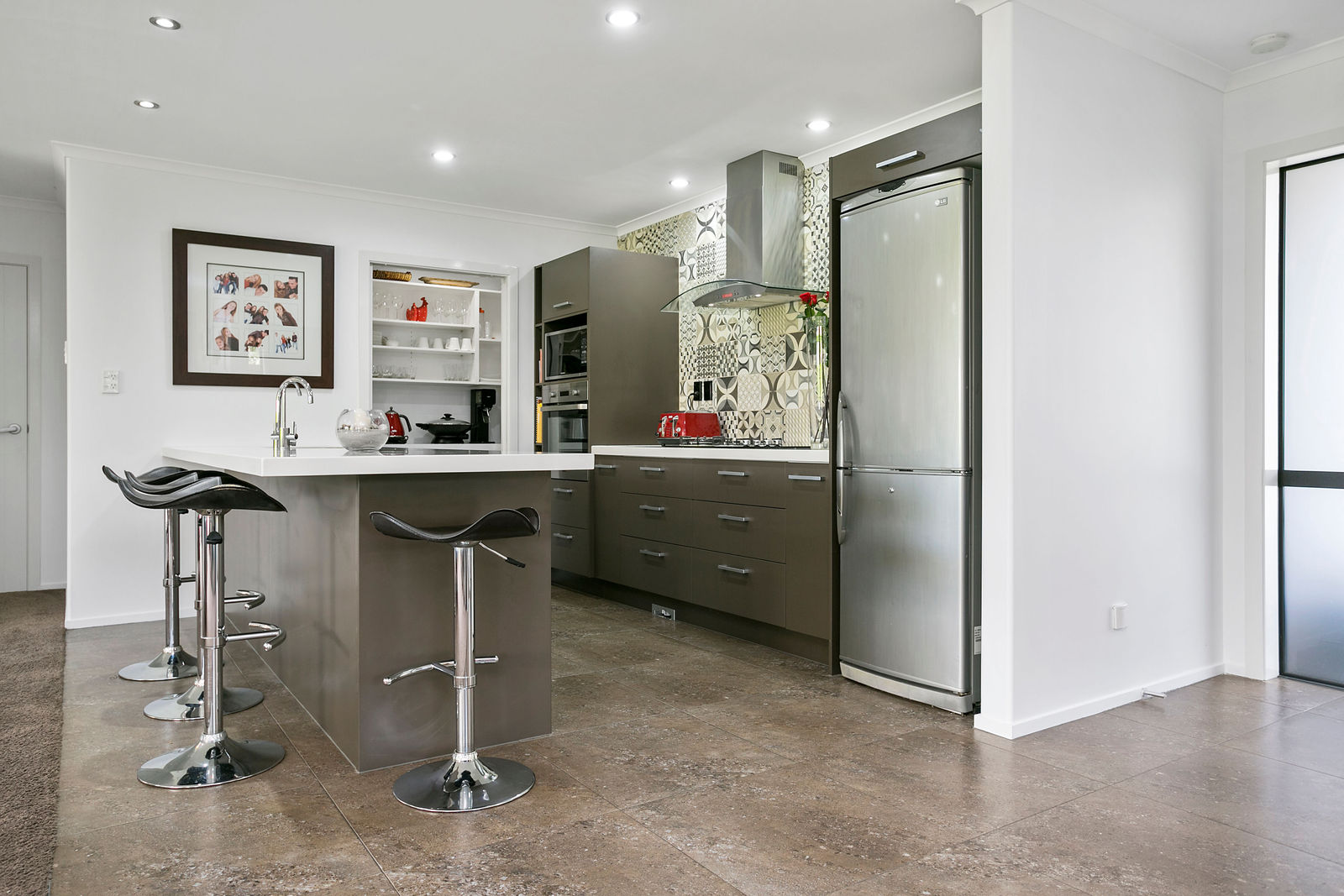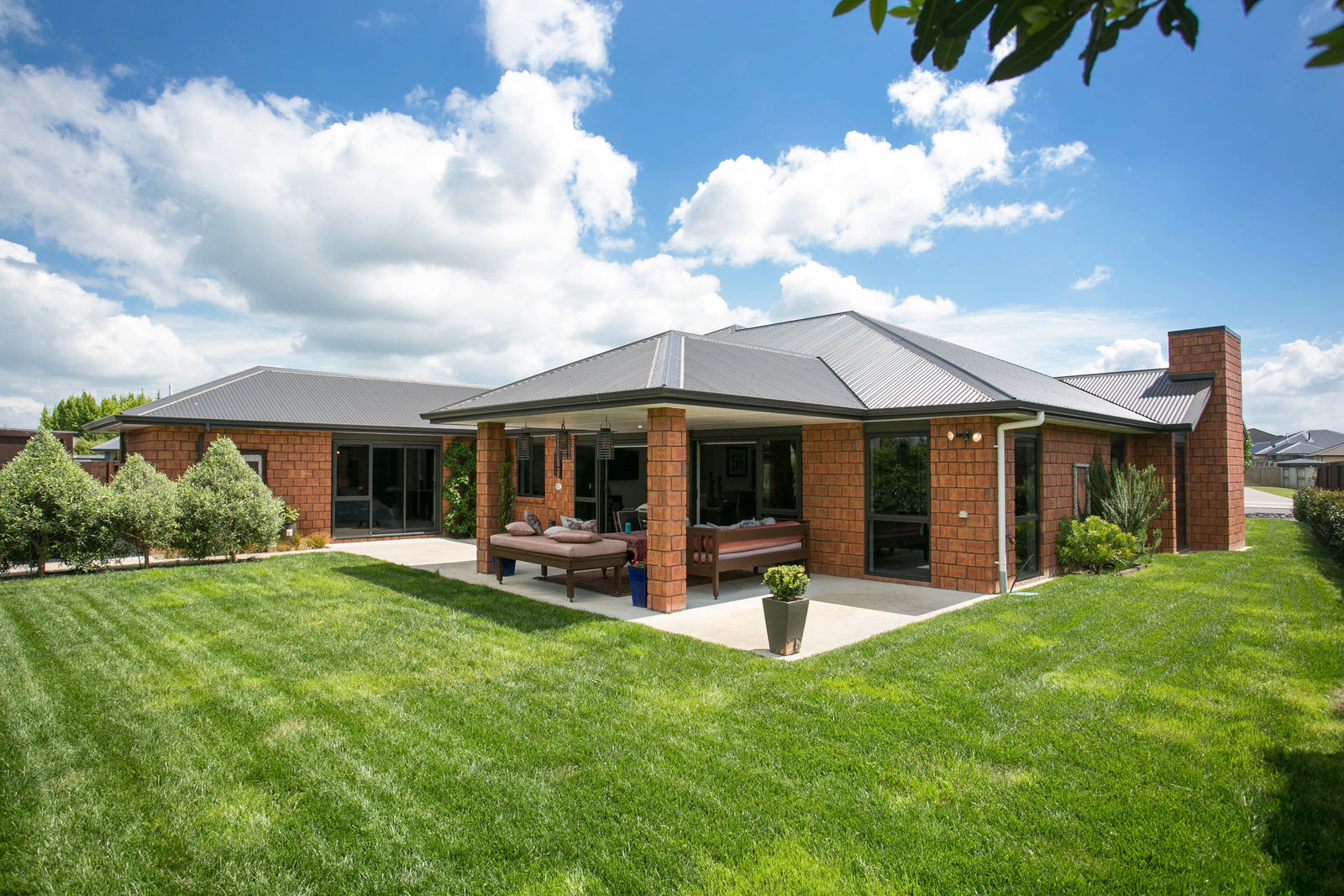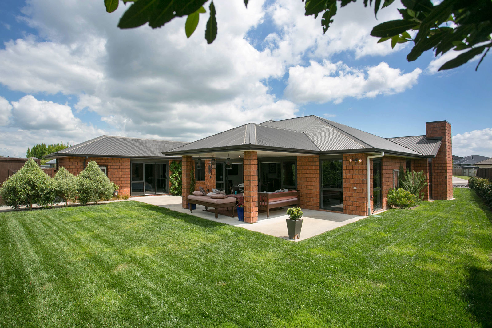 The kitchen, dining and main living room are all open and you can access the funky portico outdoor living space from this area. There is topiary in the garden that gives great structure and at the same time creates a relaxed backyard.