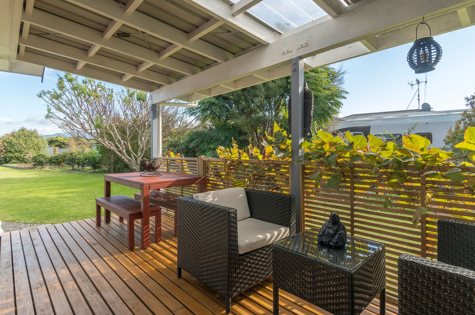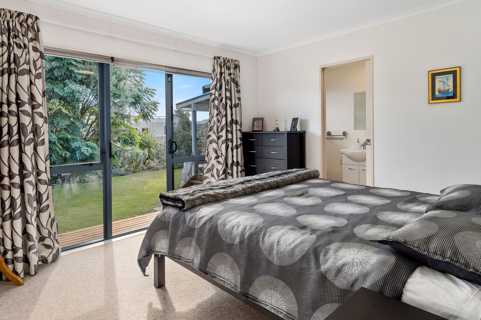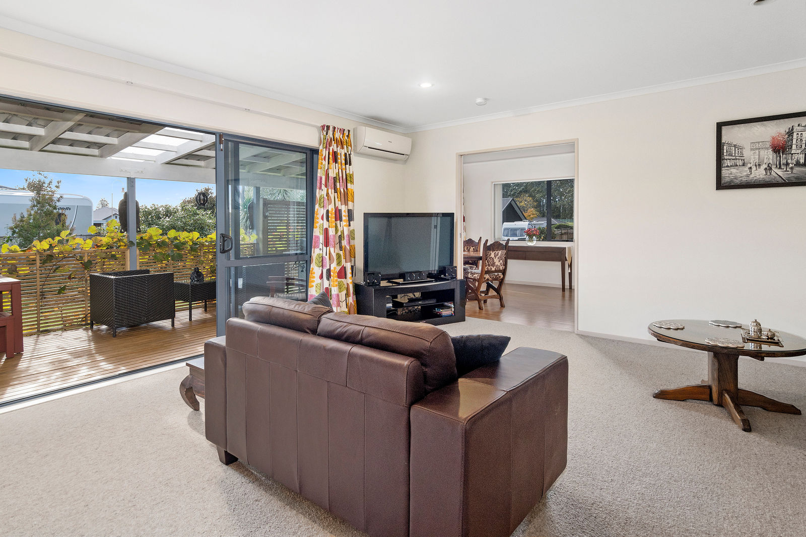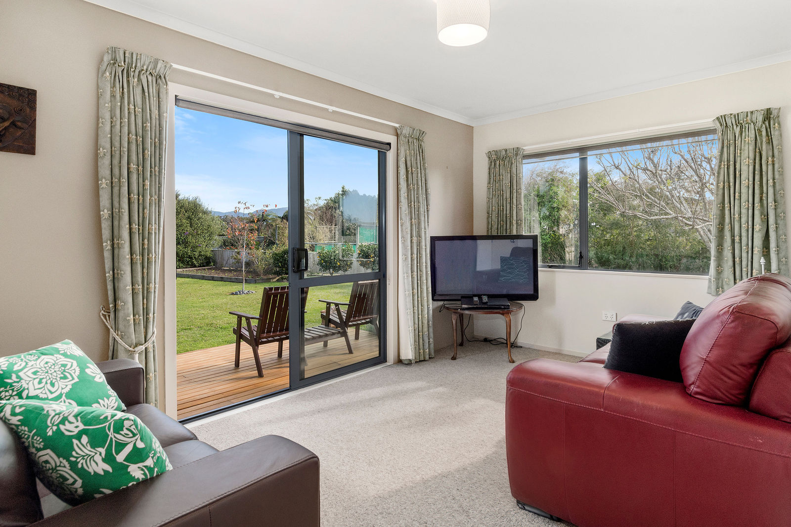 The master features its own en-suite and peaceful private garden, as well as its own deck. One of the other bedrooms is currently set up as a sun lounge opening out to a deck with uninterrupted views of the Kaimai Ranges.
