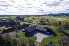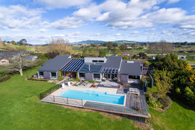 Presenting an exquisite architectural design emphasising light and space, this stunning home, on an impeccably landscaped 5562m2 (more or less) block minutes from Cambridge, takes lifestyle living to new heights. Nestled in a secure, picturesque environment with uninterrupted views over Maungakawa Scenic Reserve and the Te Miro hills that will surely impress! The 480m2 (more or less) double glazed, north-facing home delivers high-end living that seamlessly interacts with sheltered alfrescos, an entertainment precinct and heated salt water pool. An overarching sense of rural tranquility pervades this family oasis. Interiors, set under dramatic high ceilings, favour a free-flowing layout encompassing distinct spaces for media, lounging, dining and entertaining. A focal point is the stunning kitchen comprising quality appliances in abundance, and an ambience created by the assemblage of composite stone, stainless steel and timber. All bedrooms are large doubles, with superior appointments. Two share an ensuite, three enjoy their own heat pumps. The master wing impresses with its stunning views, sunny position, two big dressing rooms and deluxe ensuite. The newly carpeted garage area boasts a separate country sized laundry, and accommodates three vehicles with ease, has an internal clothes line, a versatile mezzanine and access to the gym, or office. There is also a stand-alone garage and oodles of parking. Entry to this beautiful property is via an electronic gate. A masterful composition of building materials creates a unique home, full of panache. Several heating options, including a state-of-the-art solar heating system, ensure warm toasty interiors. Underfloor heating features throughout. Recent upgrades include a 900mm de Longhi oven and gas hob (in addition to double wall ovens), a Kent log burner, energy-efficient heating and heated swimming pool. Built with attention to detail, the home comes with numerous inclusions and design features, includi