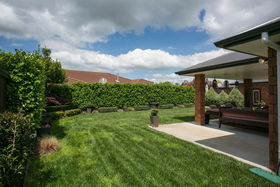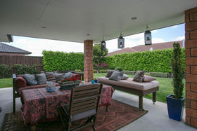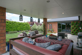 The kitchen, dining and main living room are all open and you can access the funky portico outdoor living space from this area. There is topiary in the garden that gives great structure and at the same time creates a relaxed backyard.