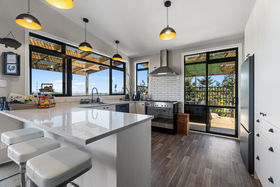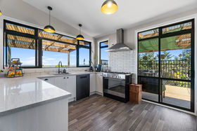 The heart of the home is its open-plan kitchen and dining area, flowing seamlessly into spacious living zones and out to a massive deck that captures breathtaking views. A wood burner ensures warmth and comfort during the winter months, while in summer, the outdoor spaces truly shine.
